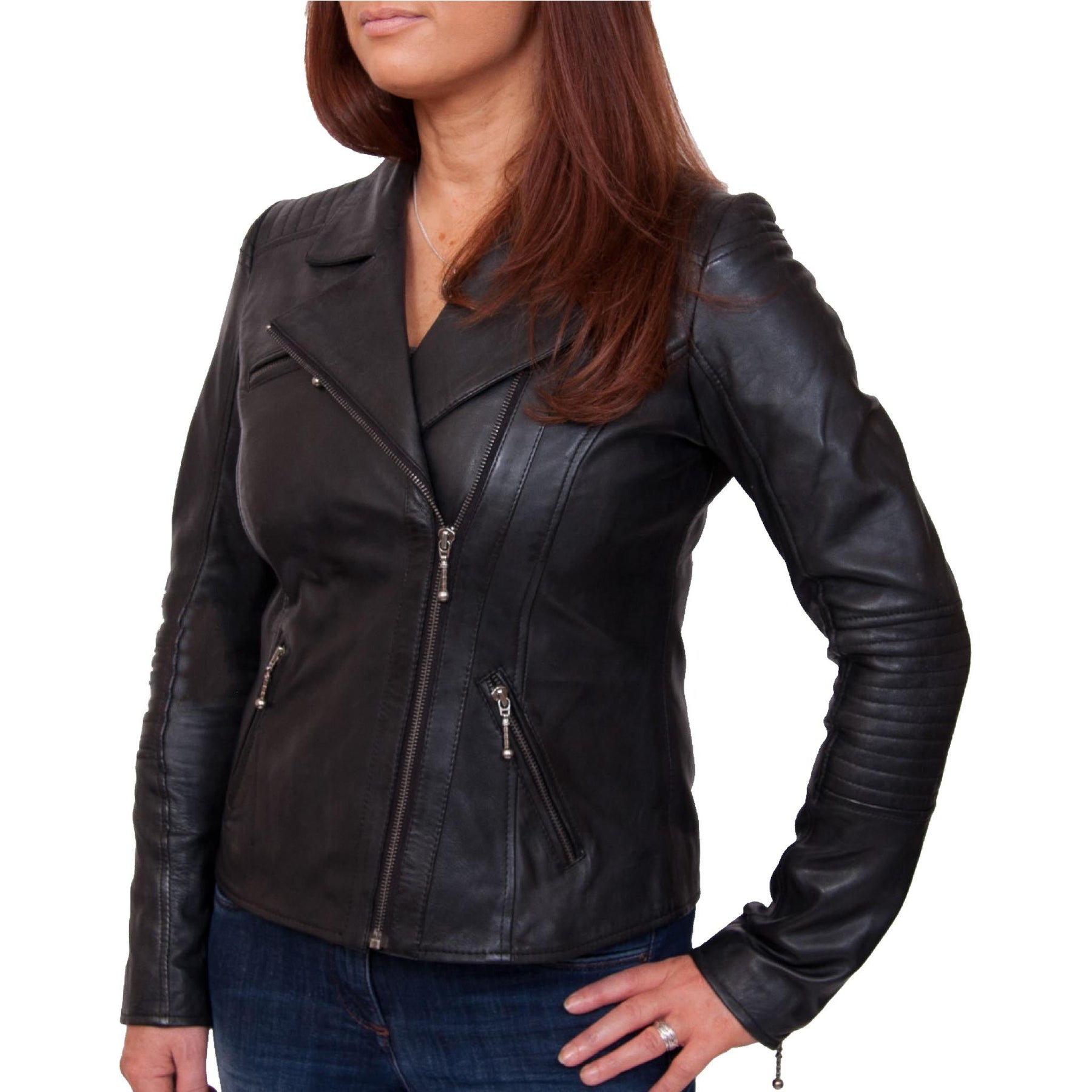 Asymmetric cross zip women's black leather biker jacket with 3 zip pockets crafted in superior soft leather for a high end finish.