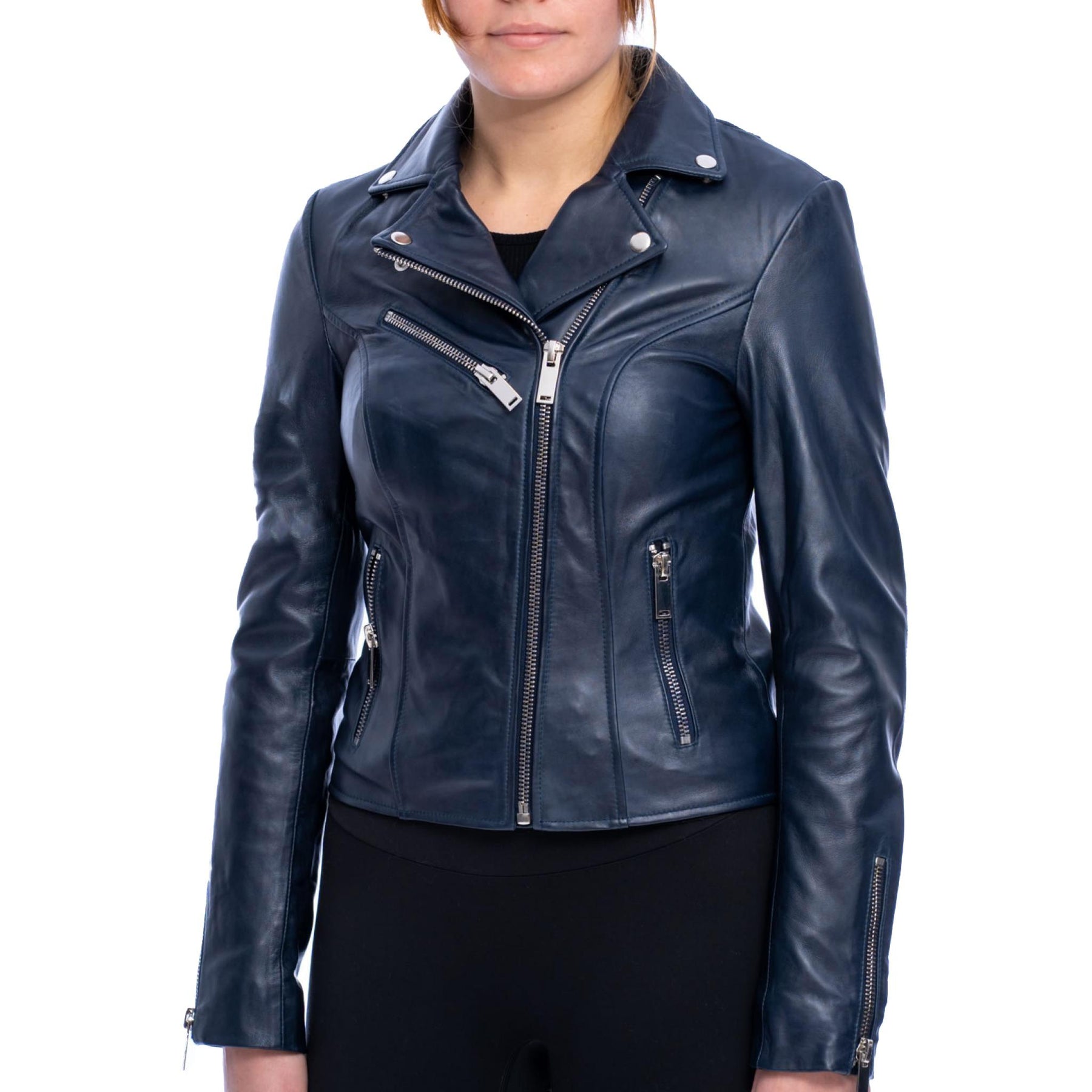 Introducing the Slim Fit Women's Blue Café Racer Leather Jacket, a stylish and timeless addition to your wardrobe. Made with 100% genuine Napa leather, this jacket boasts a vintage-toned finish and a gratifying cut that's both elegant and flattering. The semi-fitted style is shaped into the waist for a flattering silhouette, and the short stand-up collar with a leather tab and single-press stud adds a touch of sophistication to the design. The YKK zips are attached for stiff quality, ensuring durability for years to come. The jacket features a straight center zip fastening and dual seam stitch detailing, and the upper chest section has two zip pockets in a horizontal position. The lower waist section offers two zip pockets in a soft angled position, giving you ample space to carry your essentials.